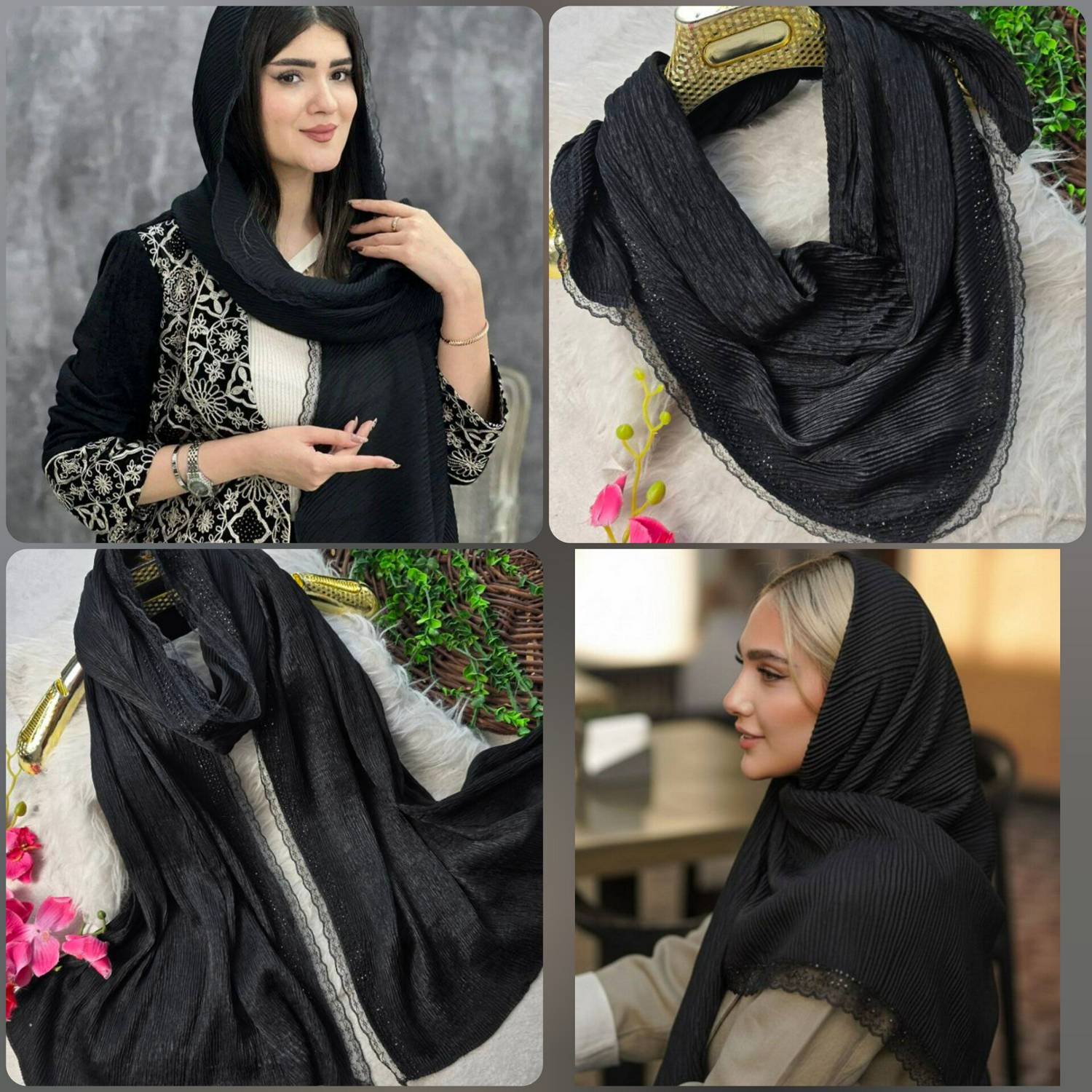 جنس : روسری ژاکارد پلیسه و لبه دانتل و شال کرپ نخ